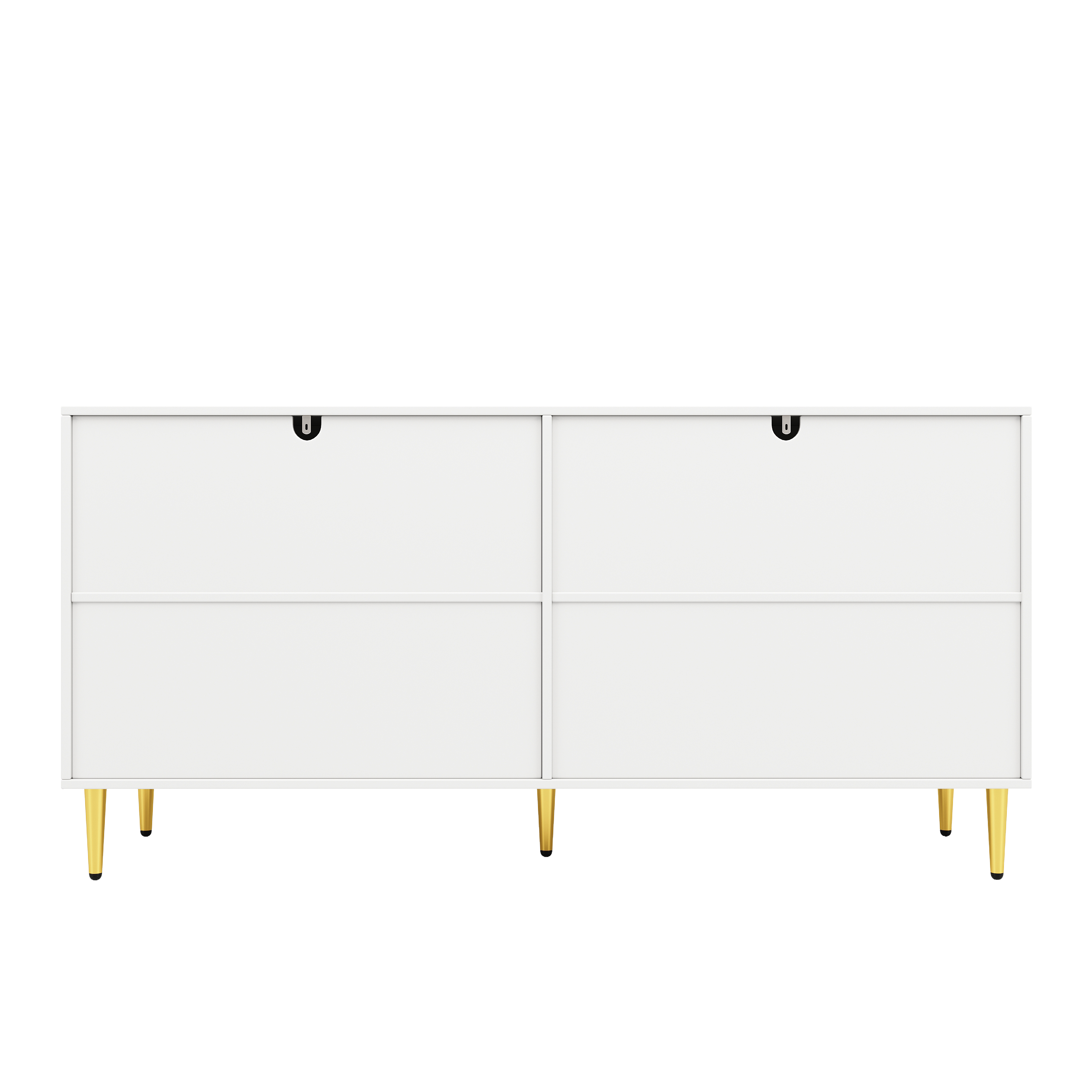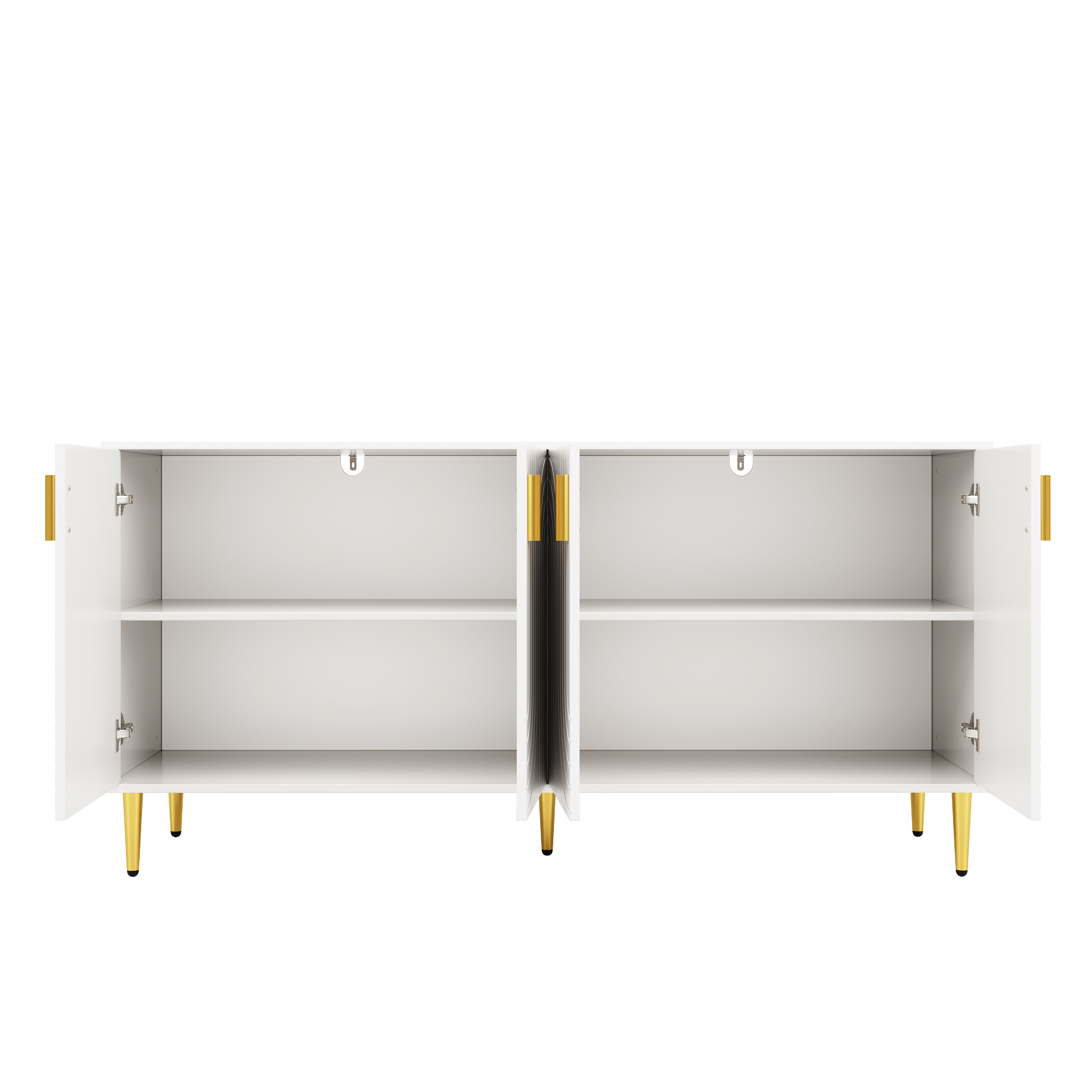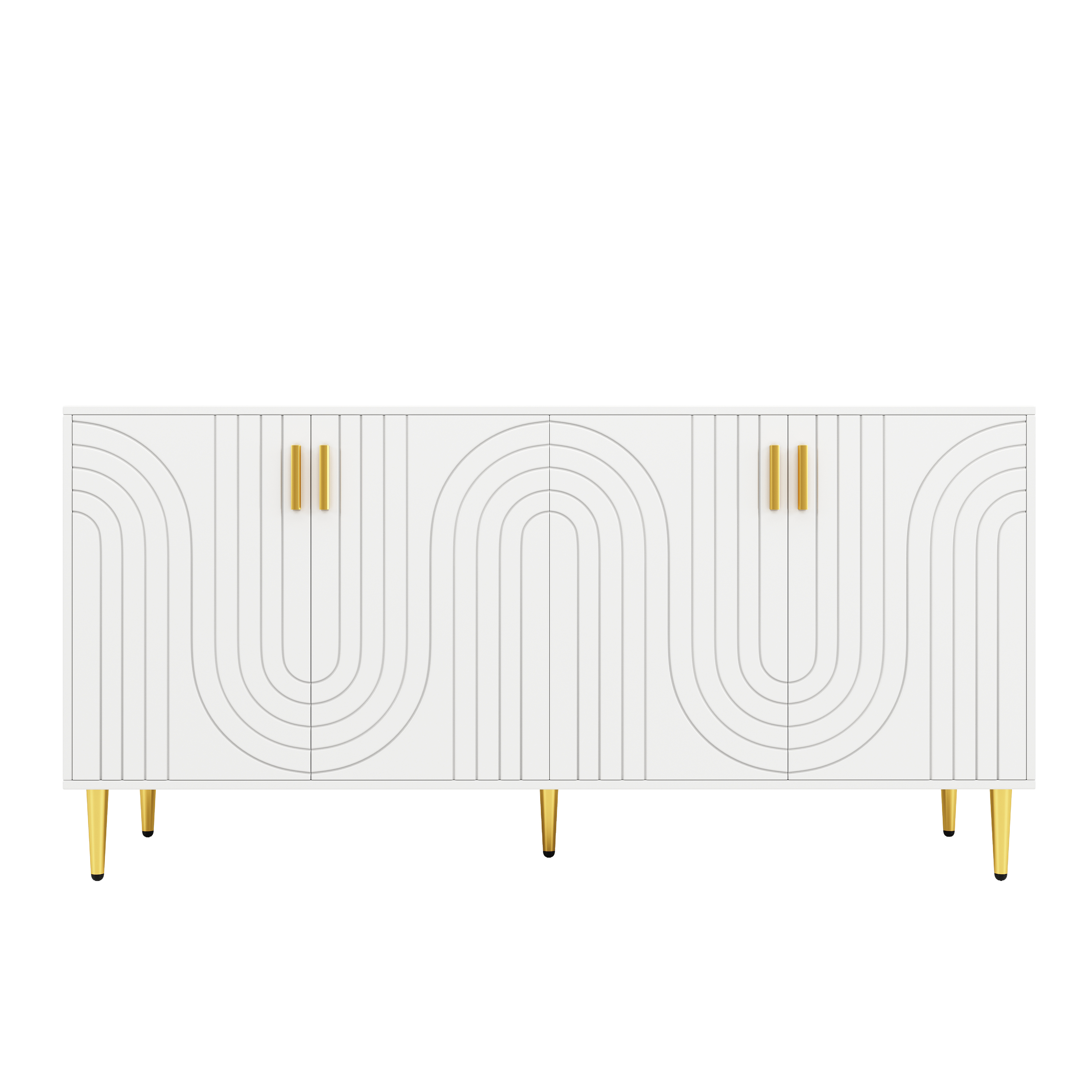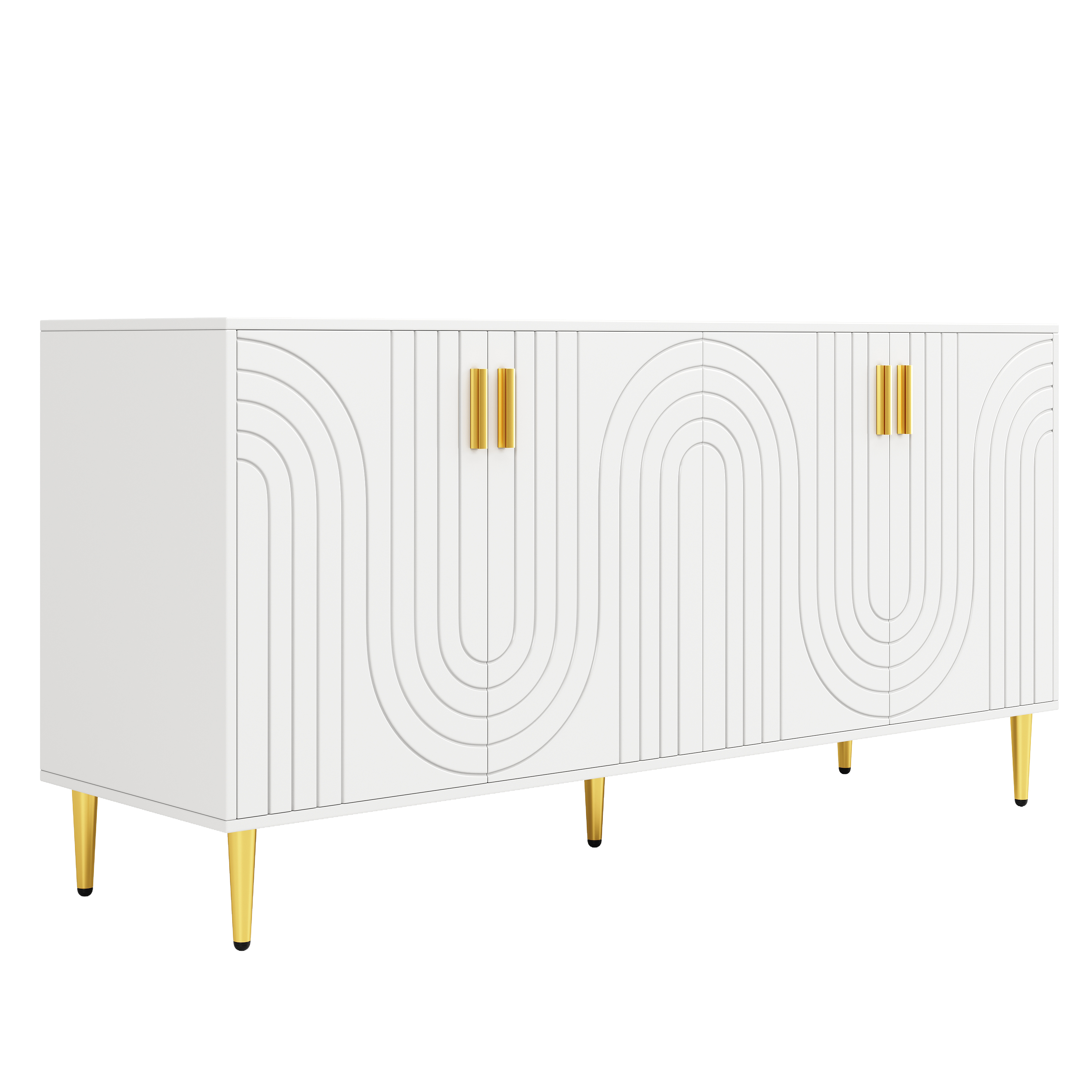 Product Name:White sideboard (152 x 40 x 75 cm) with unique wave design and golden handles and feet, creating an elegant dining area